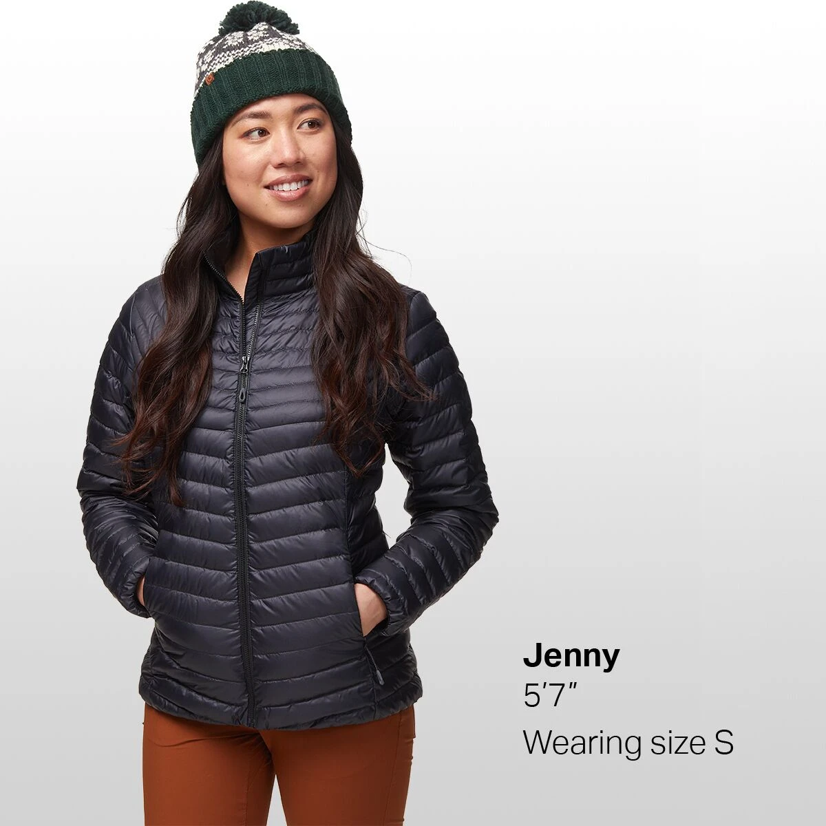 - Recycled down provides sustainable warmth in dry, cold weather