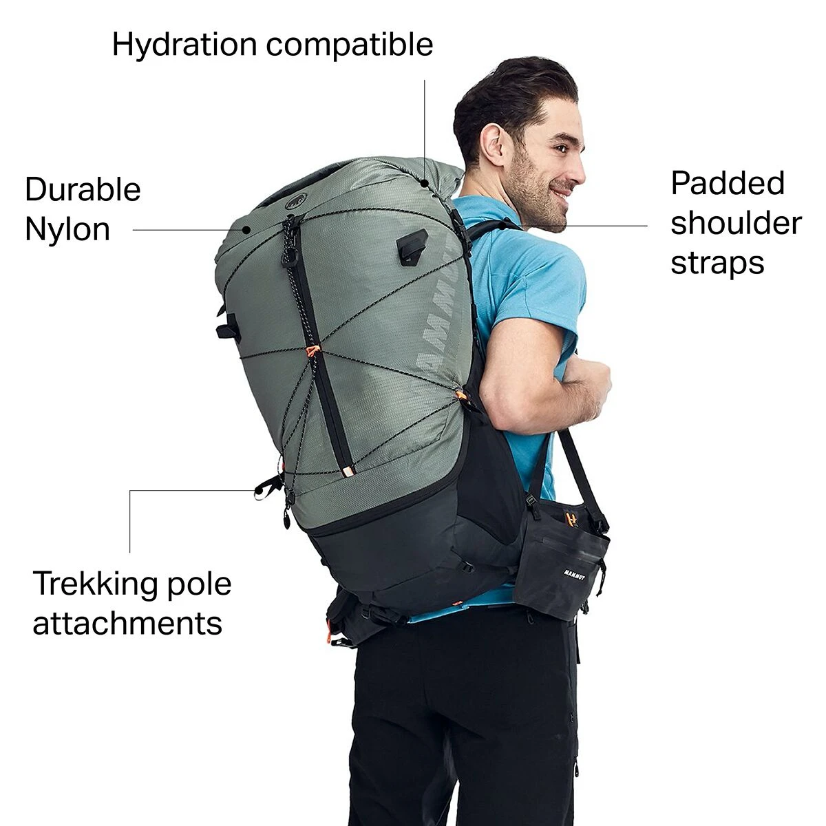 - Water-repellent pocket has multiple attachment options