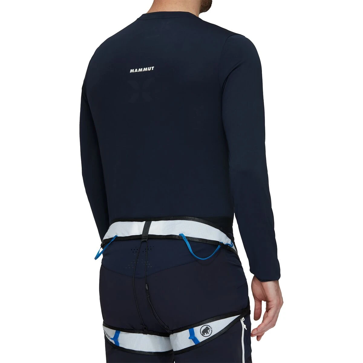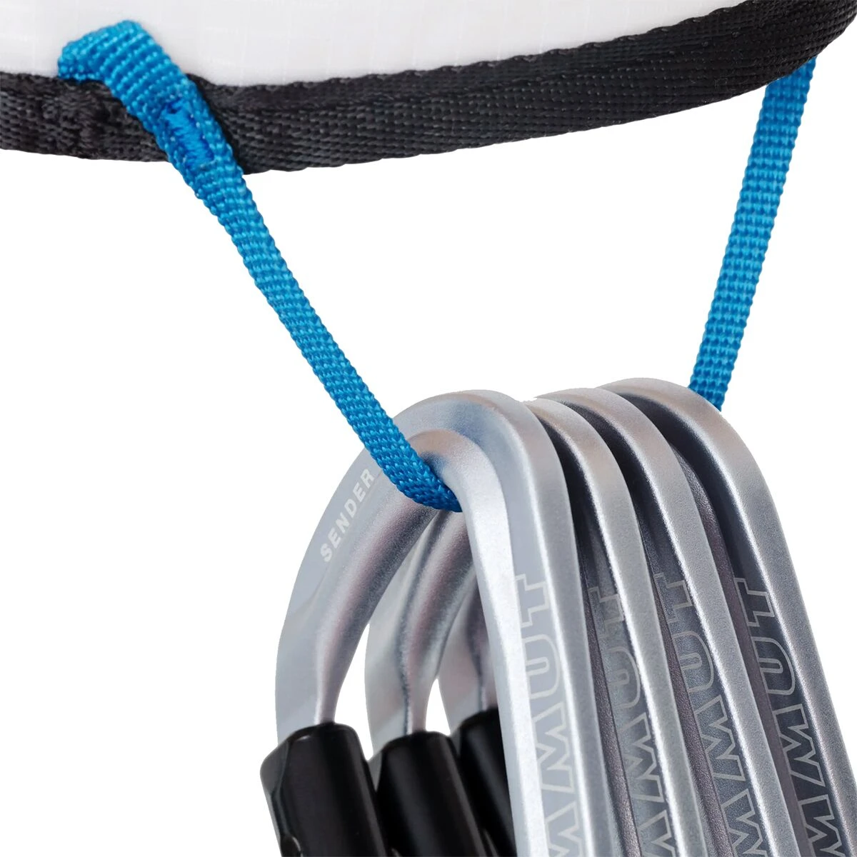 A climbing harness for when every last ounce countsreach your best ever speeds on ski tours or mountaineering. We developed this harness together with Nico Hojac, an icon of speed mountaineering. It’s made from tough, completely recycled ripstop material, and has two tie-in loops and leg loops that are big enough to get into with mountaineering boots on. And there is plenty of storage space, with room for two ice-screw carabiners, two ice-screw keepers on the leg loops and gear loops. All of that at the smallest possible size and weight.