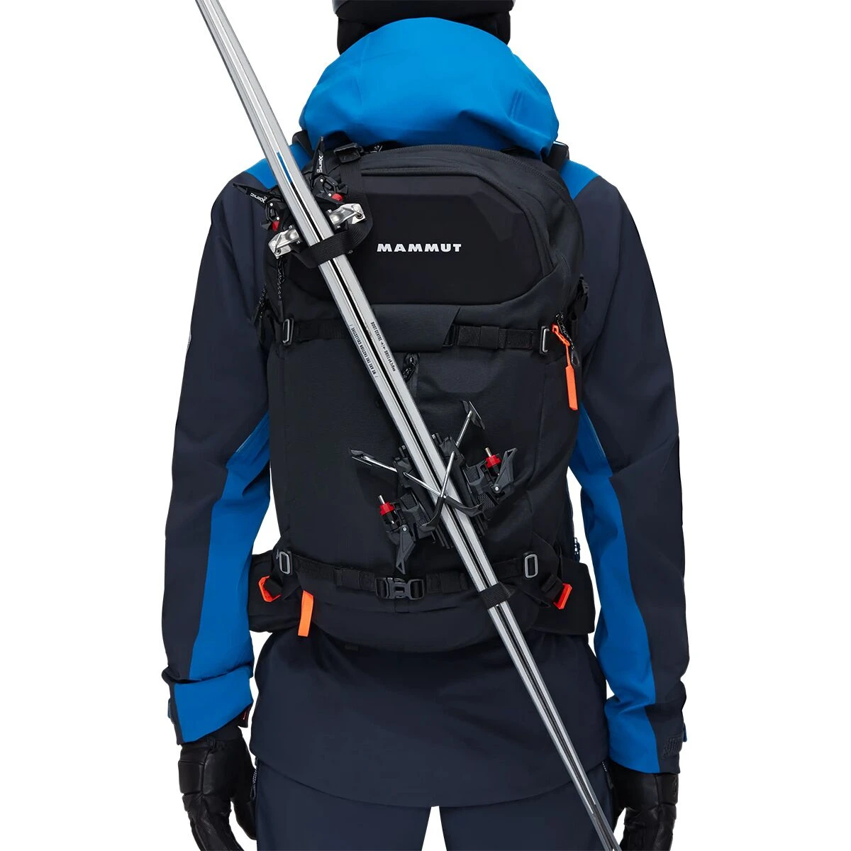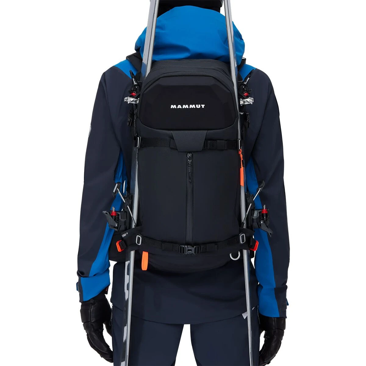 The Mammut Nirvana 35L Backpack brings zen-like balance to the backcountry when you’re touring for a day. It has a U-frame that keeps things stable even when you have skis or a snowboard attached, and the waist belt is detachable for quick “one-and-done” tours. This pack can also attach ice axes, ski poles, helmets, and trekking poles, leaving room inside for a hydration reservoir—which has its own dedicated sleeve—and all your personal necessities. You can access the main compartment through the back panel, even with a snowboard or skis attached, and the front compartment has organization for your shovel and probe. Skis can be carried A-frame style or diagonally, and a soft-lined goggle compartment keeps your eyewear safely accounted for.